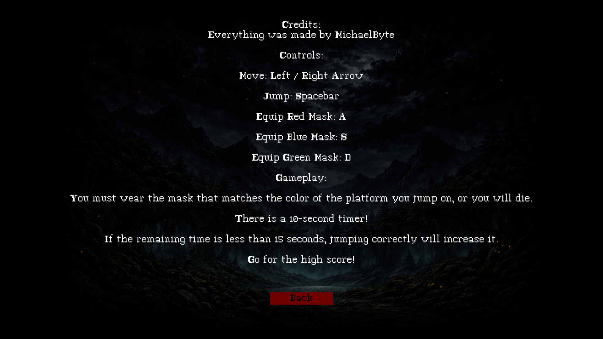 Jump between platforms, switch masks mid-air, and avoid obstacles to keep going. Master the masks, discover combos, and challenge yourself to reach higher scores. Fun, fast-paced, and perfect for quick gaming sessions !